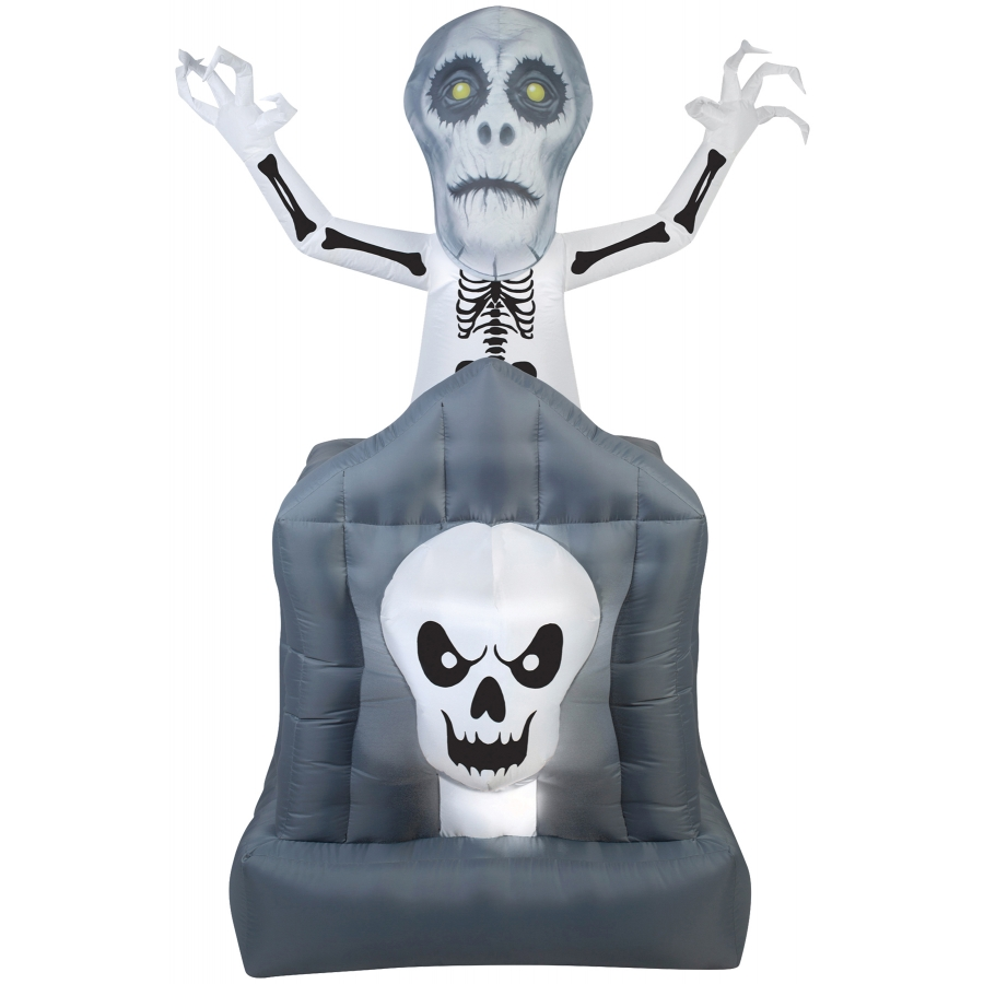 AIRBLOWN POP UP GHOST HAUNTED. This chilling inflatable is the perfect addition to your home haunt and sure to run chills up those trick-or-treaters spines and elicit blood-curdling screams! Modeled after a tomb with a skeletons head, behind is yet another skeleton seen from the torso up, arms perched as if to say that you may be the next occupant of the tomb if the skleleton can grab you! Measures 72 inches by 36 inches by 35 inches. No batteries needed, fully electrical.