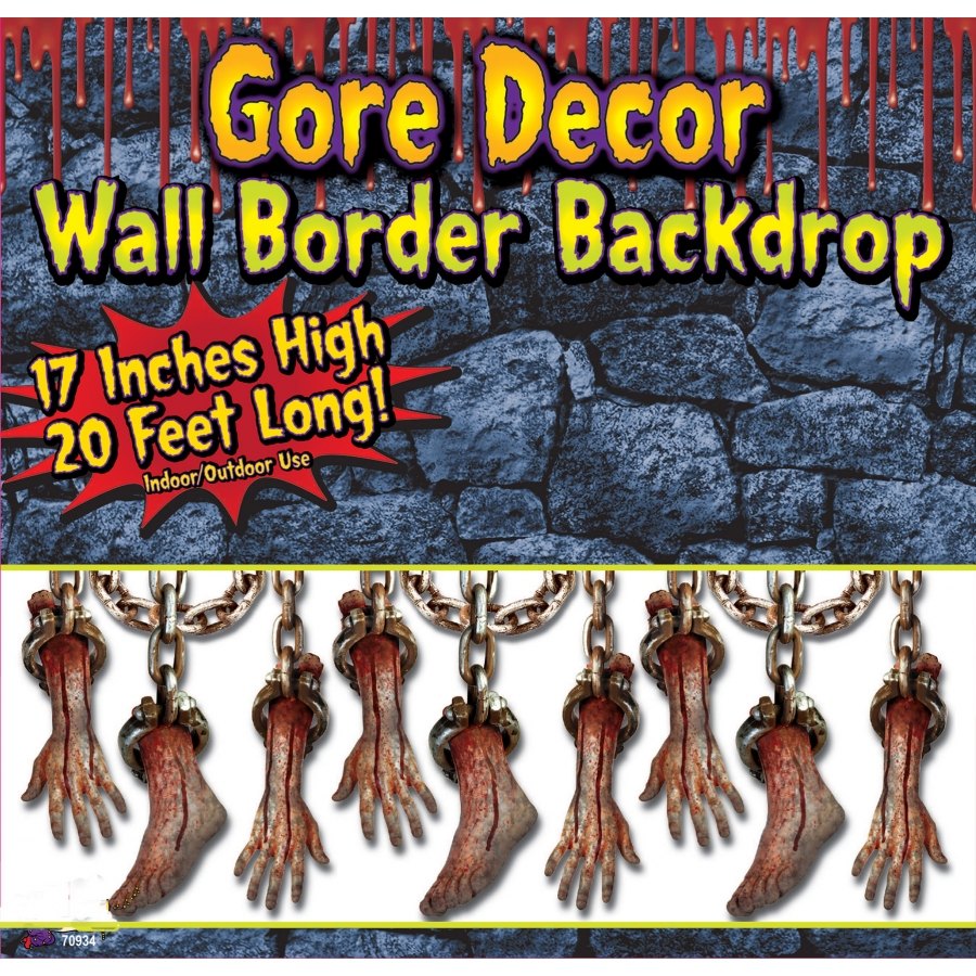 BLOODY LIMBS BORDER ROLL 20. A nice decoration for your haunted scene. Border roll features life-like depiction of cut-off hands and feet. 20′ x 17″