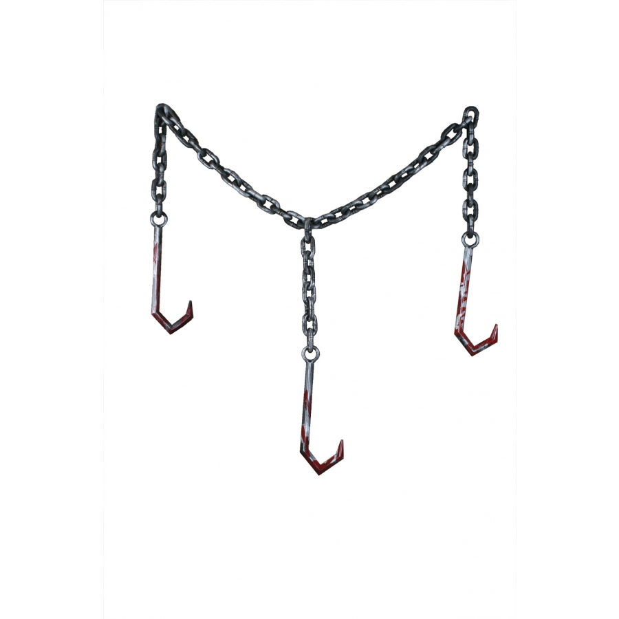 Looks like something straight out of a horror movie. 3 bloody meat hooks connected to old look plastic chain. Great decoration item for any haunted house or home haunter.