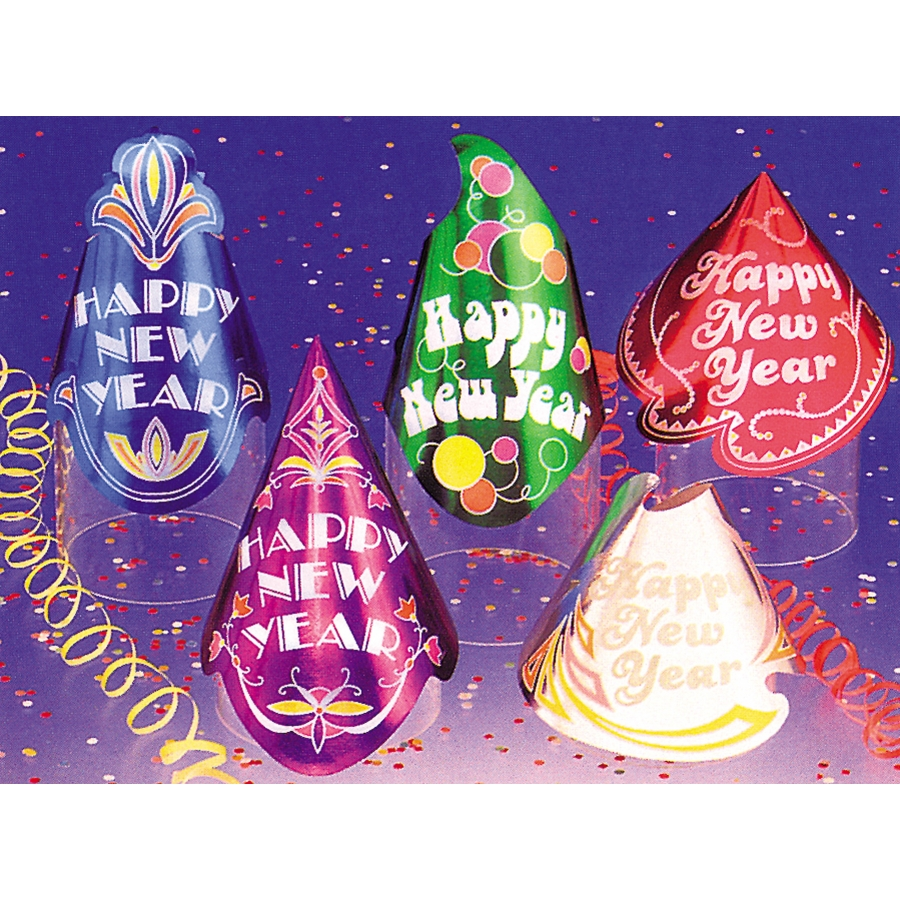 CHAMPAGNE NY HAT 50=1. Five styles of festive metallic foil party hats! Boxed in a 50 piece assortment. Great for New Year’s Eve!