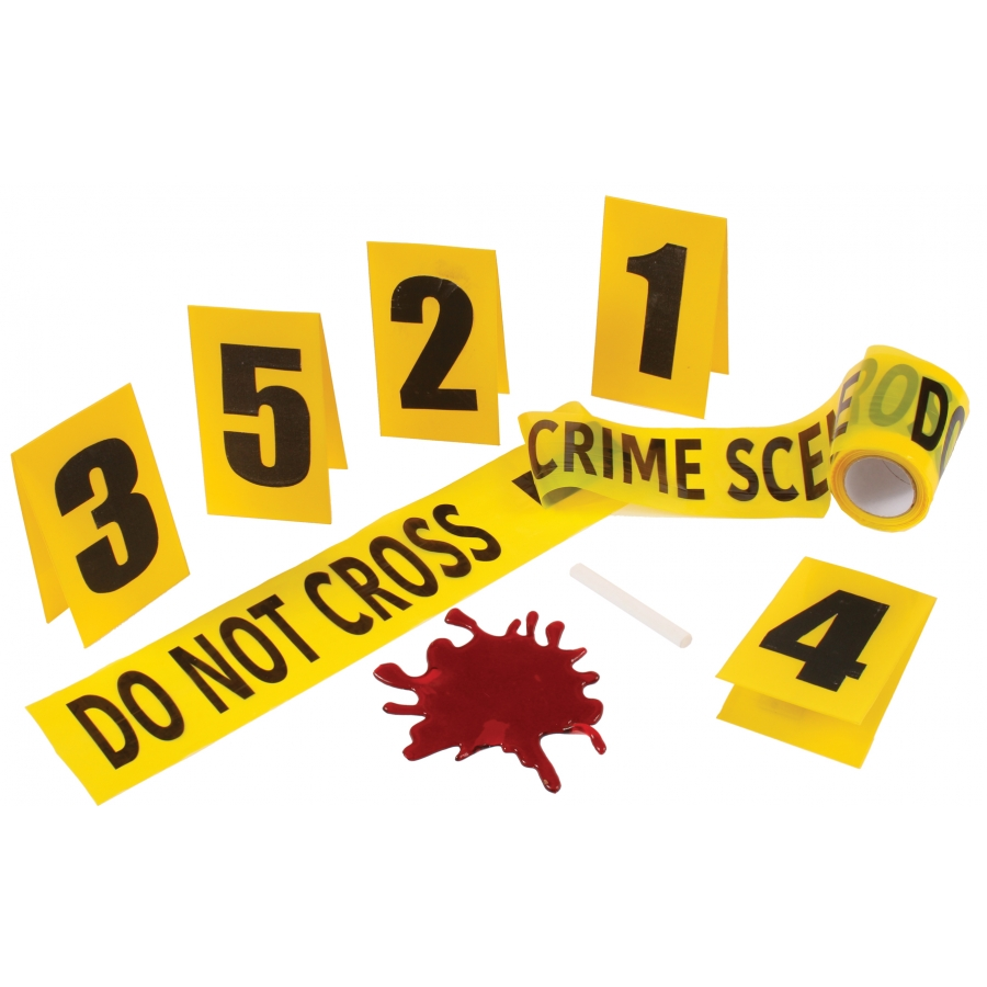 CRIME SCENE KIT W/BLOOD SPLAT. The perfect kit for mapping out a murder scene! 100 feet of caution tape, 5 evidence markers, chalk, and blood splat. Great for murder mystery events!