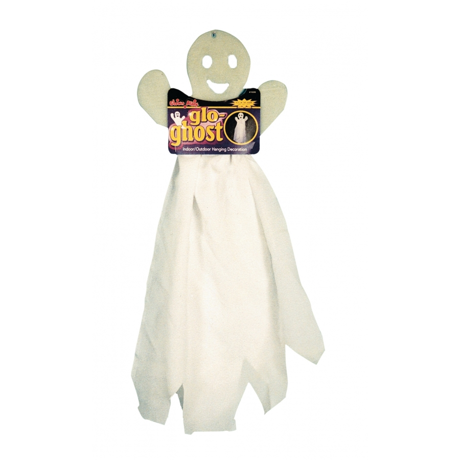 GHOST FLOATING GLOW. Friendly glow-in-the-dark plastic head and arms with a flowing white, cloth body. 22 inches tall and 9 1/2 inches wide.