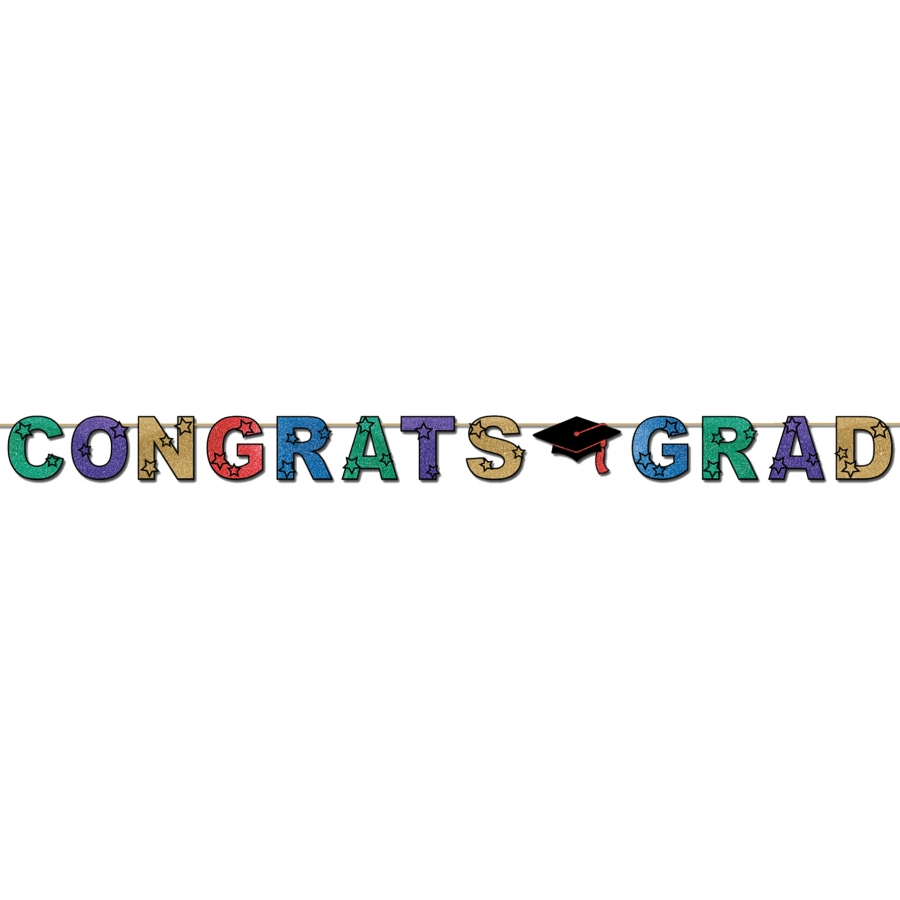 GLITTERED CONGRATS GRAD STREAM. A great decoration for your favorite graduate’s celebration party! This multi-colored “Congrats Grad” glittered streamer is sure to be a great final touch! Paperboard/Cord. 8 1/2in x 10ft.