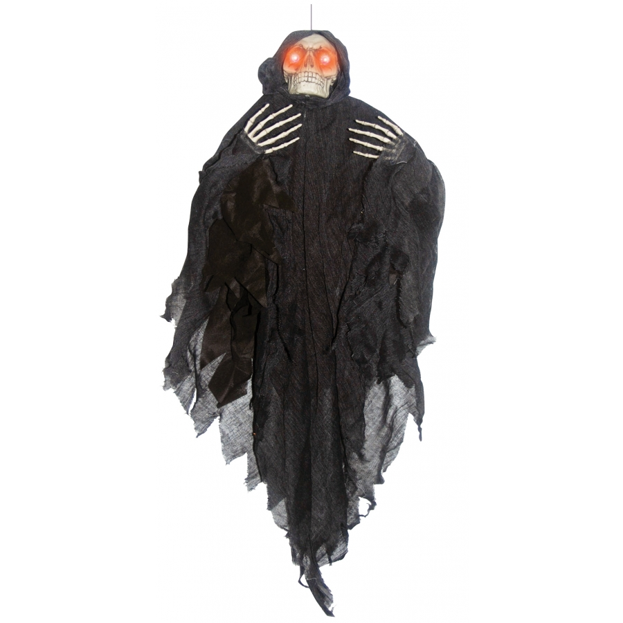 HANGING LIGHT UP BK REAPER. 3 foot tall hanging reaper with light up eyes and posable arms. Shredded cloth costume design. Requires 3, AG13 Watch batteries. (Not included) 48 x 30 x 3″