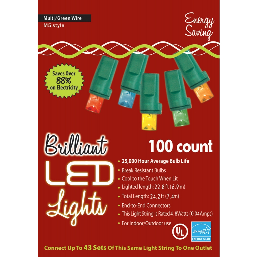 HOLIDAY LIGHTS 100L M5 MU. String light set perfect for Christmas or party decoration! 100-count Brilliant LED lighting. Multi-colored lights has green cord that has end to end connectors. String has a 22.8 ft lighted length/24.2 ft total length. Rated: 4.8 watts (0.04amps)/set, 3.0A/120V Fuse, Spare 1 bulb/1 fuse. Connect up to 43 sets of the same light string to one outlet. Indoor/outdoor use.