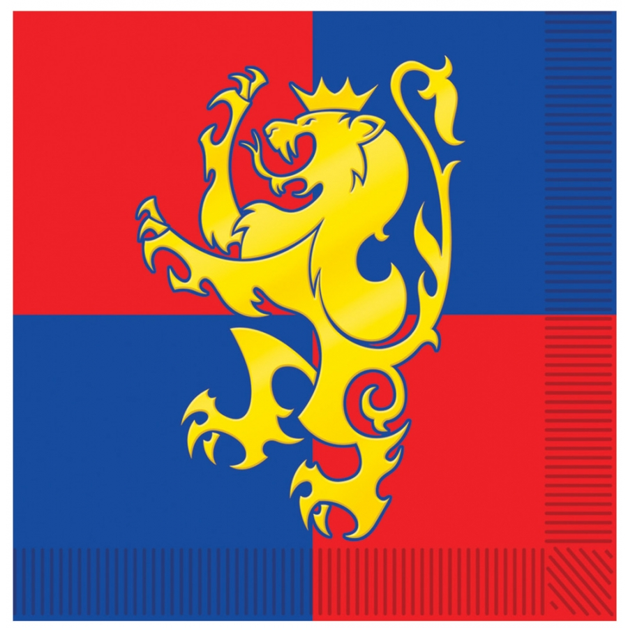 NAPKIN MEDIEVAL LUNCHEON 16PCS. The perfect napkin for your medieval-themed event. Gold lion on red and blue field. Paper. 16 napkins per item. 6.5in x 6.5 in.