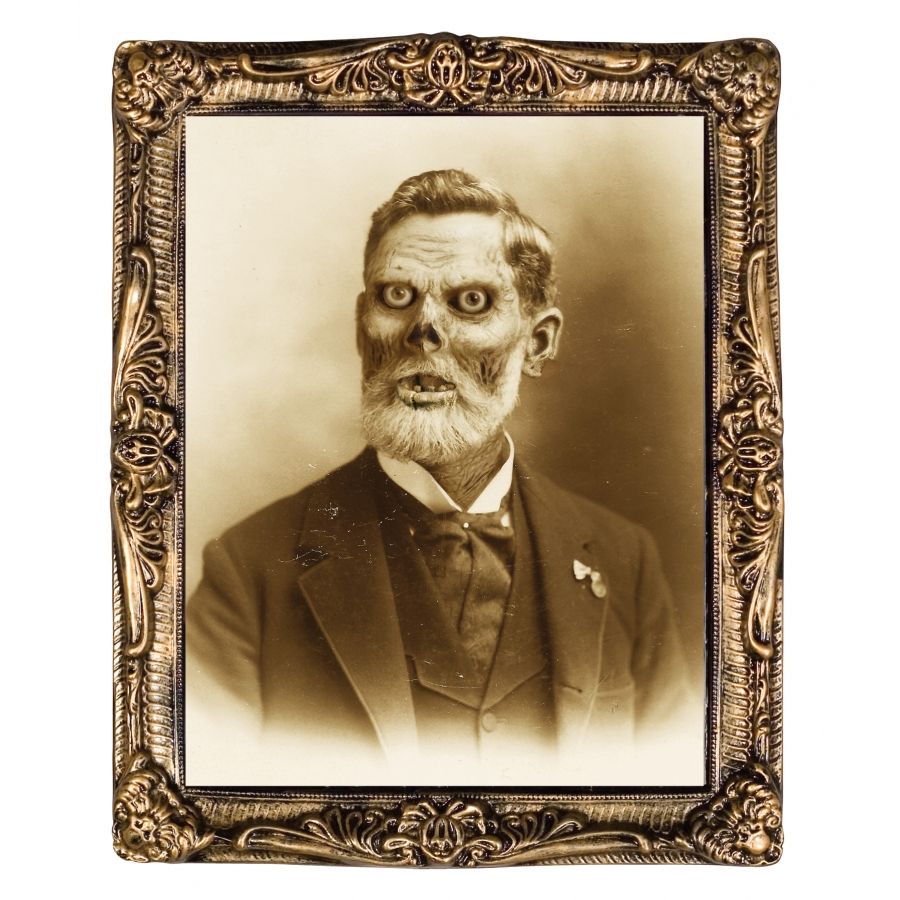 PAPPY FUNGUS 17 X 21 HOLOGRAPH. Distinguished bearded gentleman turns into a rotting corpse right in front of you! The image has a scratched antique appearance, giving the sepia-toned effect of old photography, but with a holographic twist! Portrait measures 17 inches x 21 inches including the plastic molded frame.