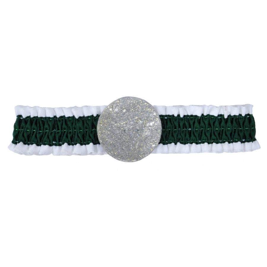 ST PATRICK ARMBAND. Ruffled green and white satin armband with a glittering button.
